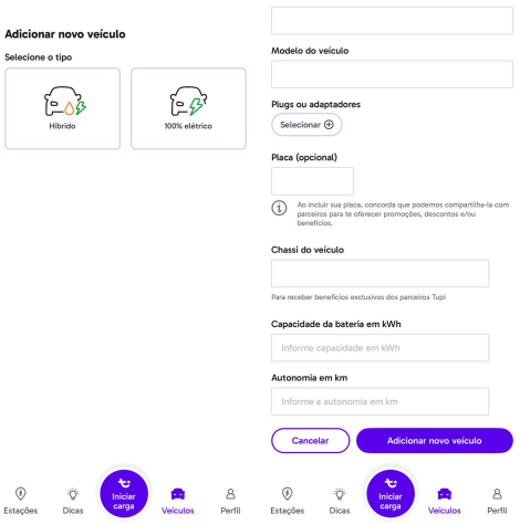 Na aba Veículos, você pode cadastrar seu carro elétrico ou híbrido. É só preencher as informações solicitadas: marca, modelo, tipo de plug e os adaptadores. Se quiser, também pode colocar a placa, capacidade total da bateria, autonomia em Km e também o chassi que é muito importante para ficar por dentro de todos os benefícios exclusivos dos parceiros Tupi!