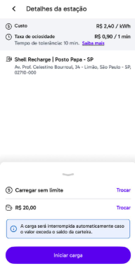 Caso não queira seguir com esta definição, apenas clicar em "Carregar sem limite" e após isto "Iniciar Carga" e seu carregamento vai transacionar energia até atingir 100% de carga ou quando realizar a finalização manual pelo app.