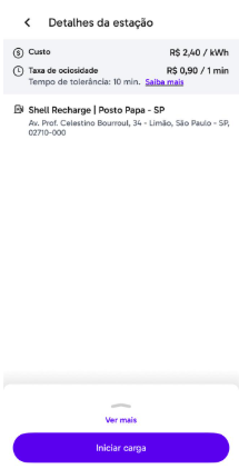 4. Após isto, aparecerá os detalhes da estação com as informações da tarifa, taxa de ociosidade (se houver) , taxa de ativação (se houver) e nome da estação com o endereço completo.