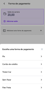 Nesta opção, poderá escolher se deseja carregar com um de valor definido optando pelo saldo em carteira ou formas de pagamento (cartão de crédito, ticket car, sem parar ou flex frota)