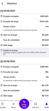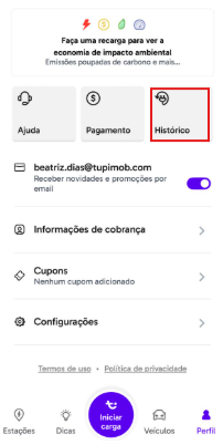 Na aba "Perfil", clique na opção "Histórico" para acessar o registro de todas as cargas realizadas e suas devidas informações.