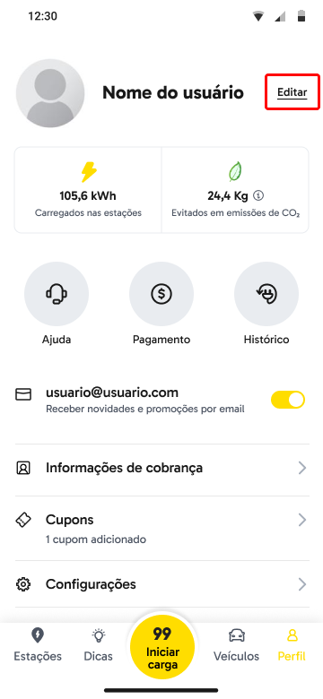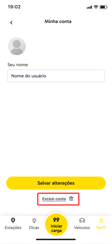 Você pode solicitar a exclusão dos seus dados e da sua conta diretamente no aplicativo 99 Recarga Elétrica.
