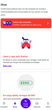 A aba "Dicas" está cheia de conteúdos para te ajudar a ter a melhor experiência de recarga. Lá, você encontra boas práticas sobre como usar as estações e dicas para manter a bateria do seu carro elétrico em bom estado.